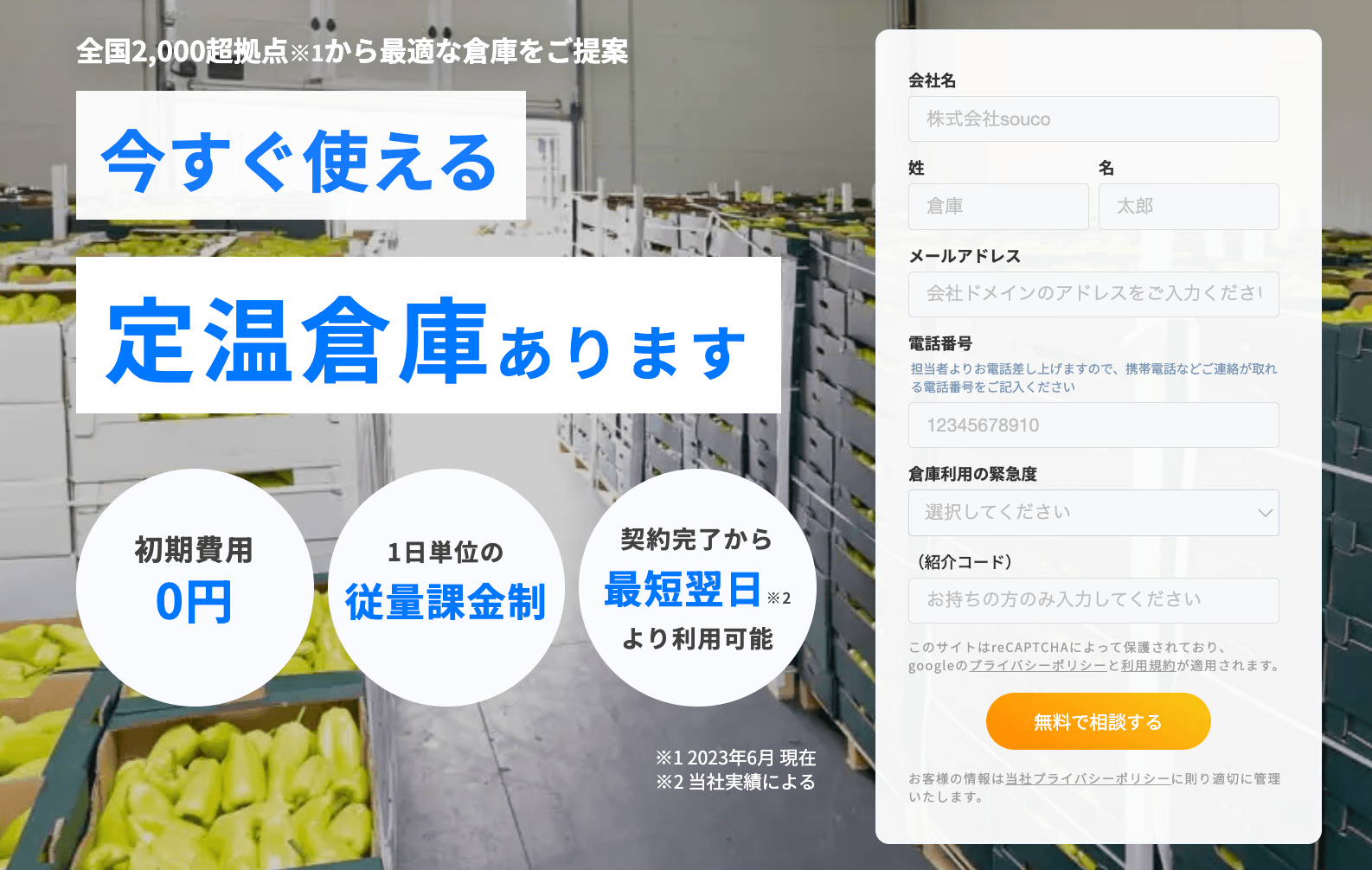 soucoを利用することにより、souco社の2,000超(2023年6月現在)の登録倉庫から顧客のニーズに適した倉庫を、全国一律、従量課金で提供することが可能になります。