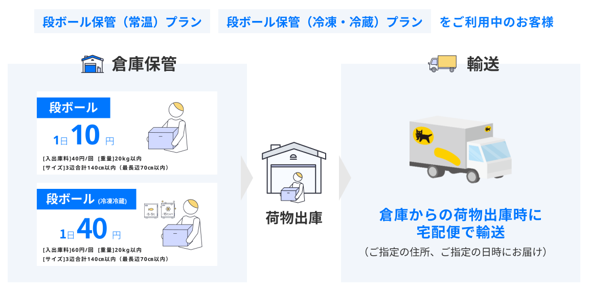 対象となる荷物は常温・冷凍・冷蔵段ボール[01]で、本サービスは荷主企業がsoucoの【段ボール保管プラン】【冷凍冷蔵段ボール保管プラン】を利用する際の輸送オプションとなります。